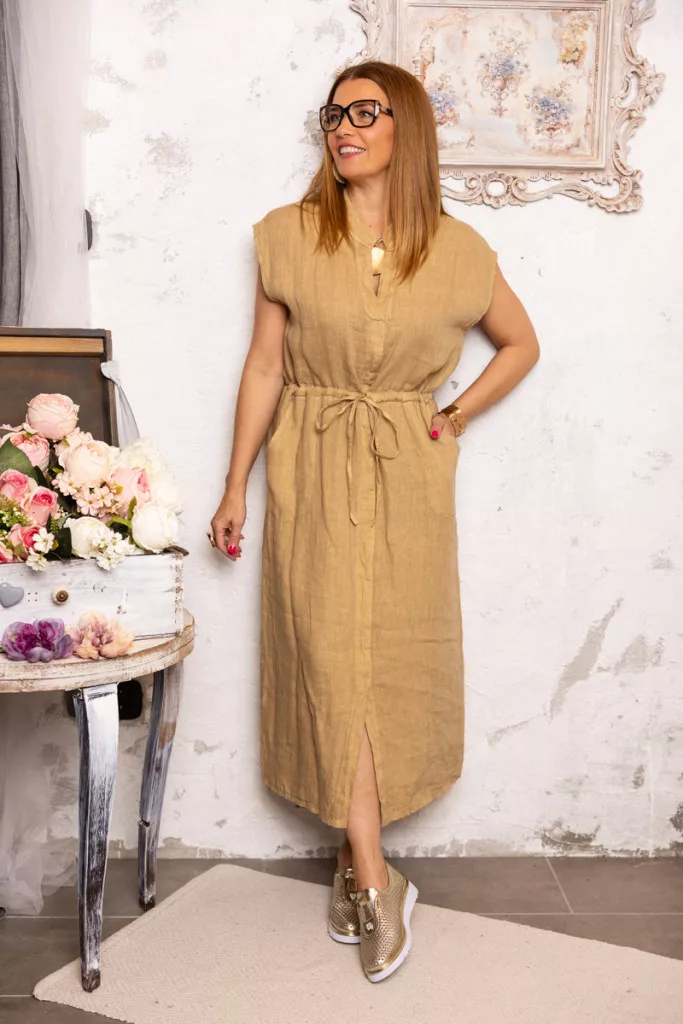 Derékkötős len ruha - barna