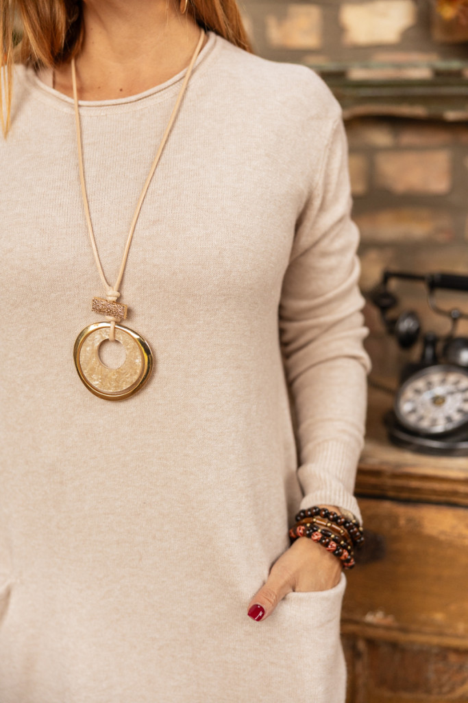 Kötött , zsebes ruha , kerek nyakkal - bézs