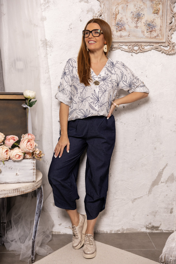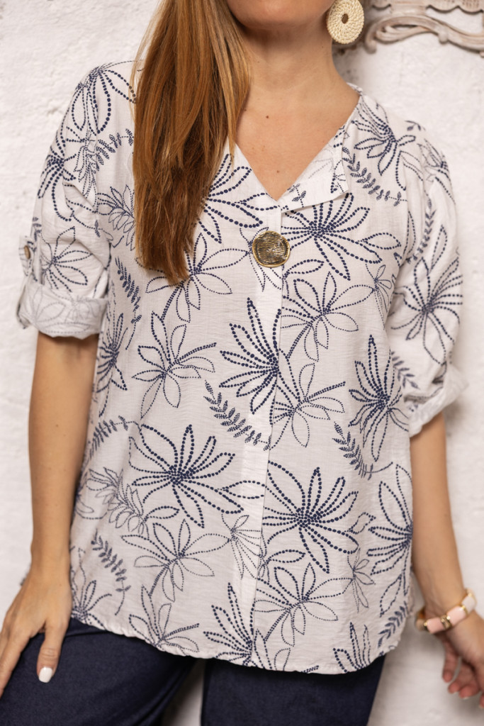 Mintás blúz , dekoratív gombbal - fehér